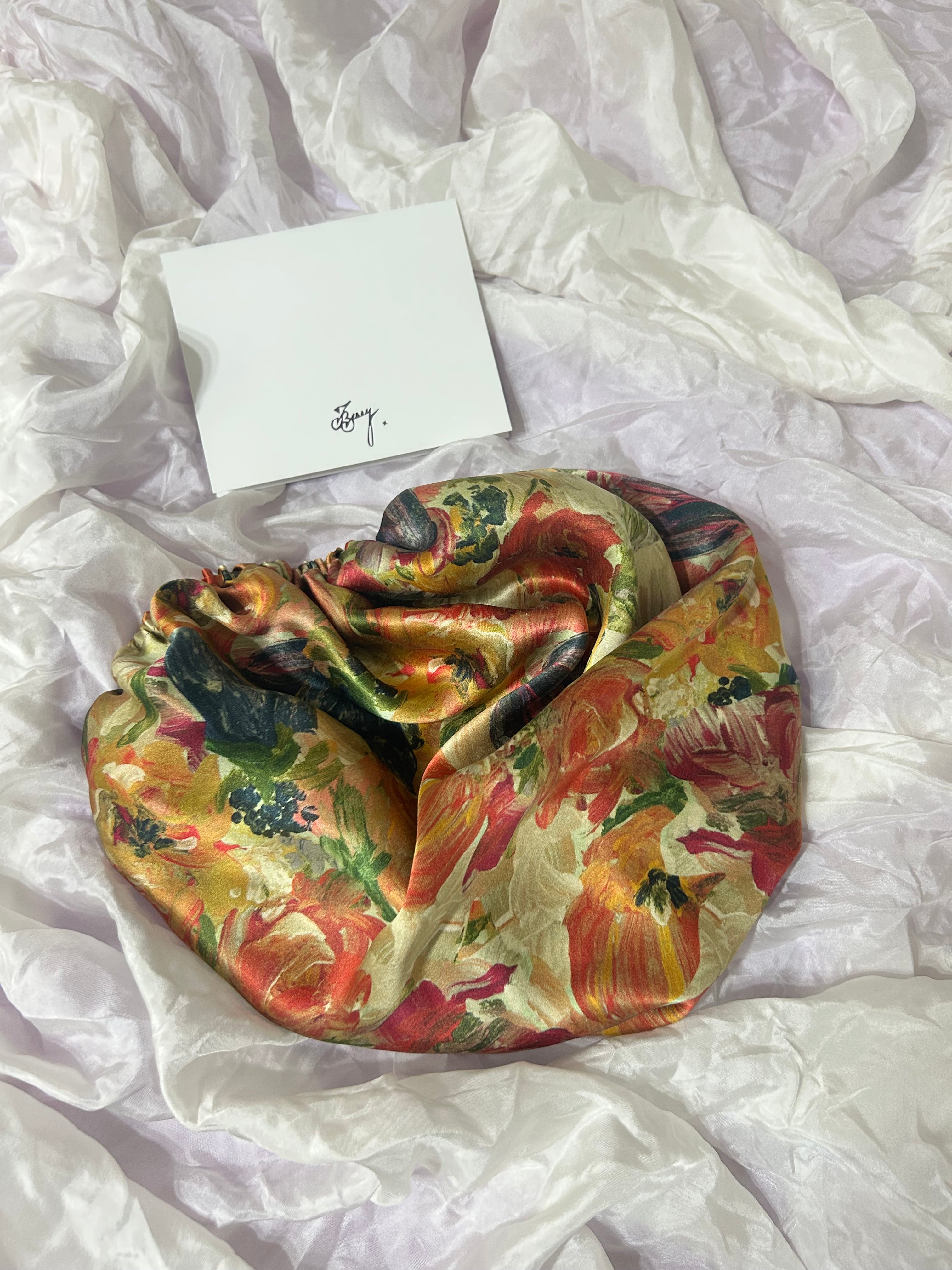 Crafted in organic, cruelty-free Ahimsa silk, Olio e Petali is an oil study of florals reimagined in a gossamer silk sheen. The silk is printed using low-impact, eco-compliant inks, preserving both the integrity of the fibre and the softness of the finish.