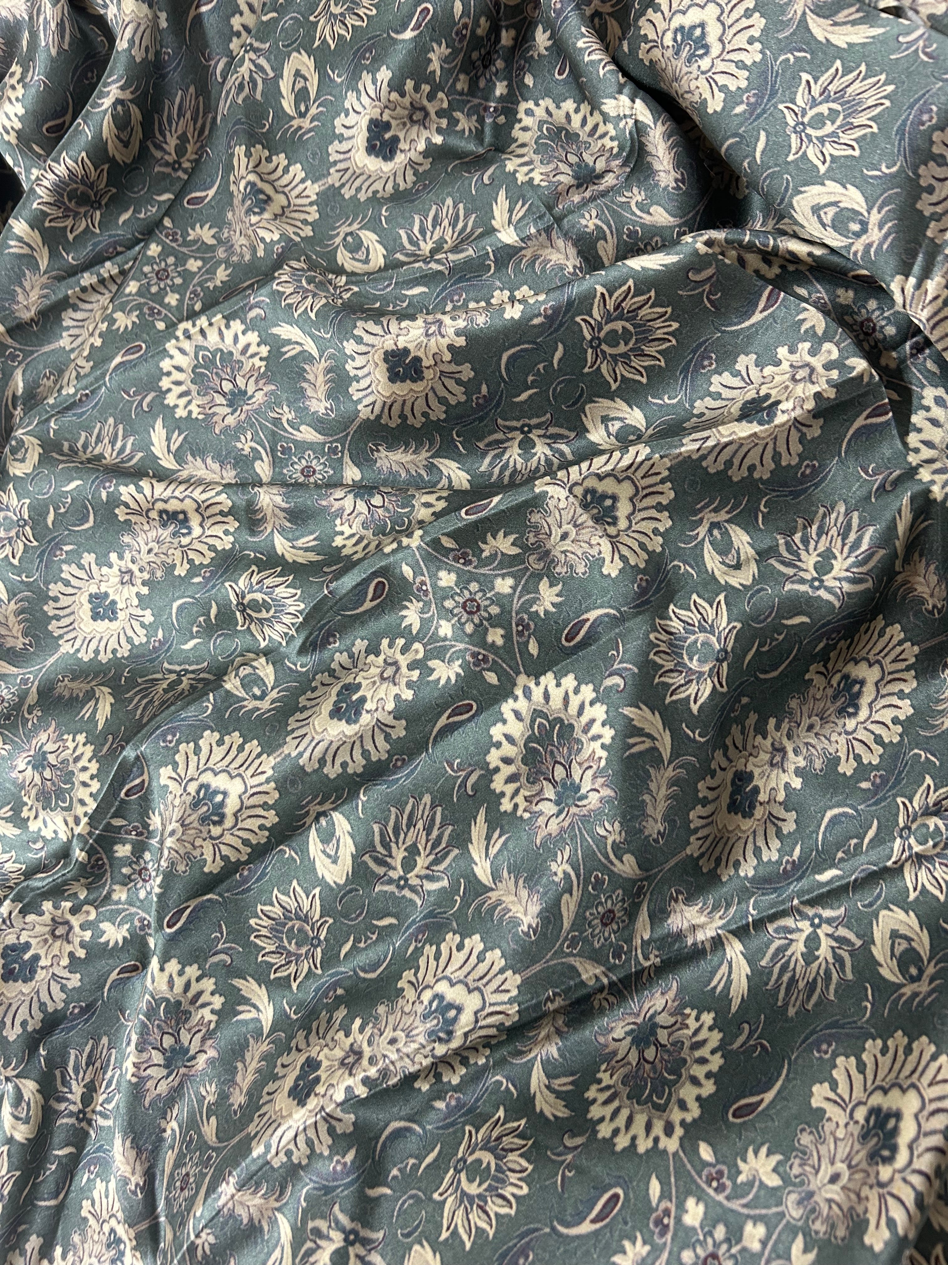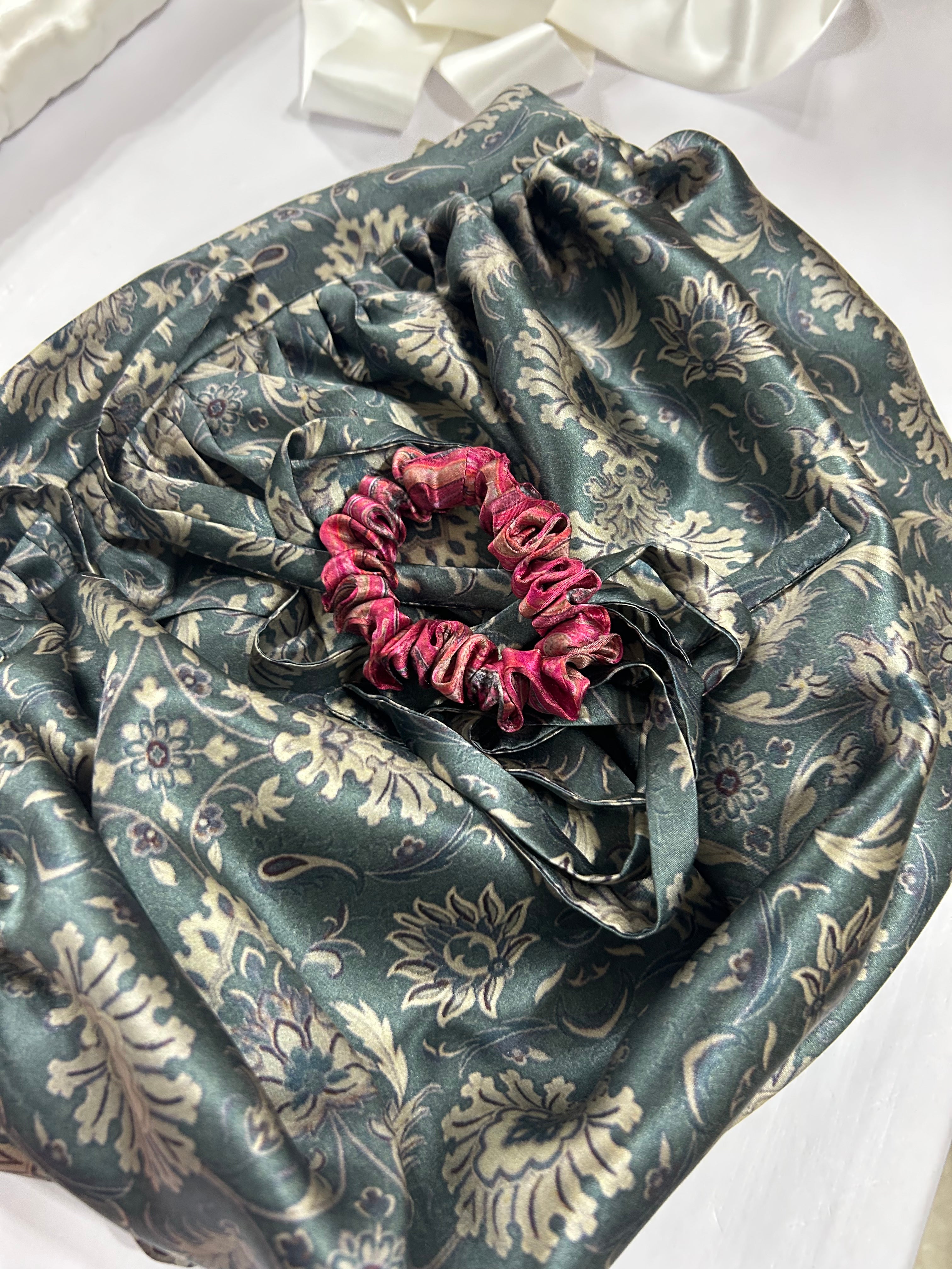 Organic Ahimsa Silk Hair Bonnet in Samirae, a jade paisley inspired by twilight companionship.